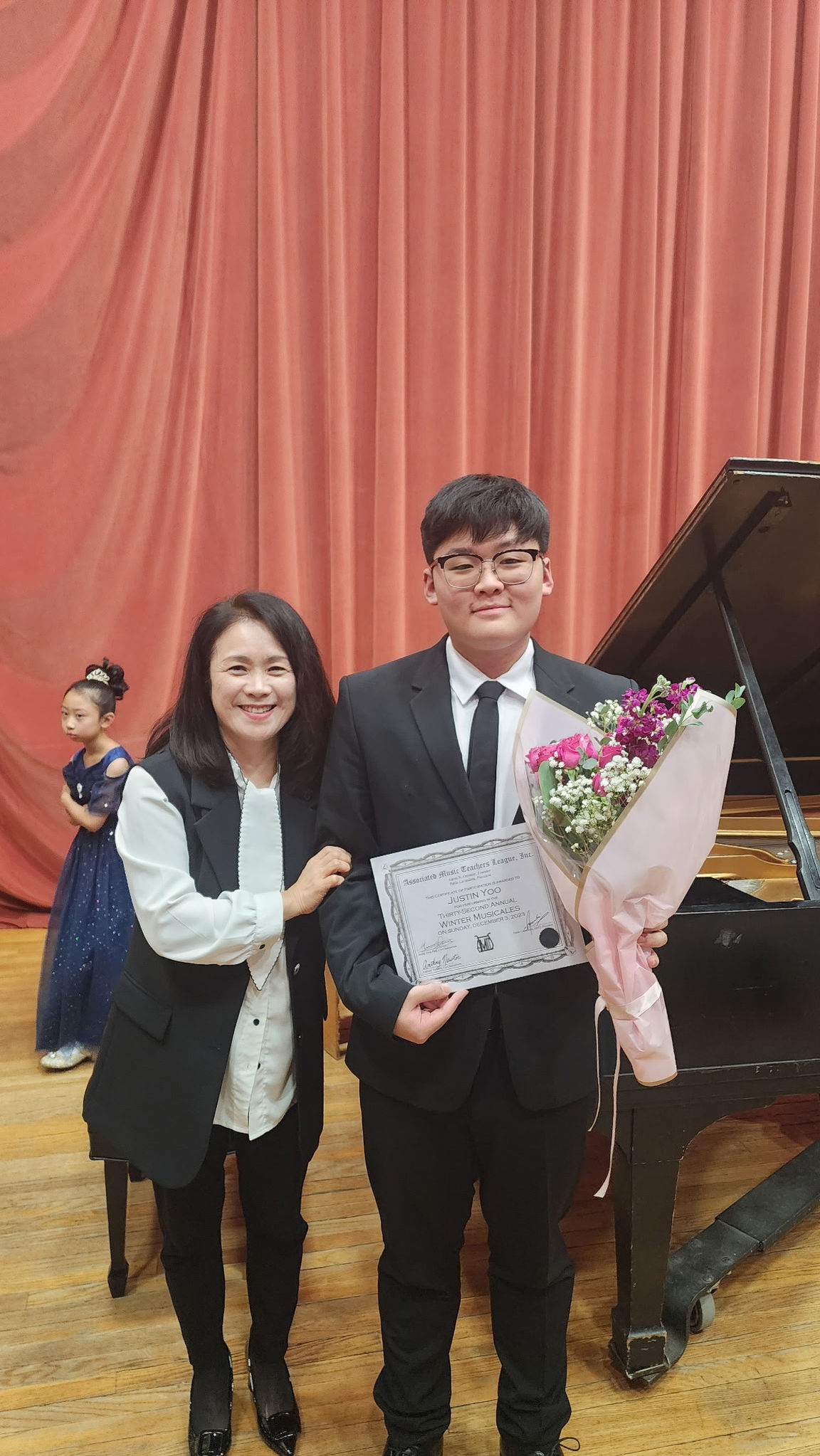 A series of images capturing people holding certificates and flowers in different indoor settings.